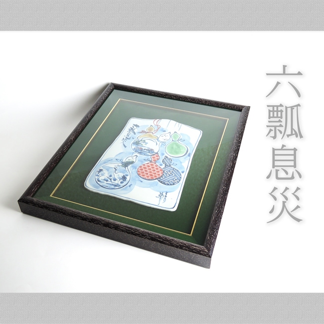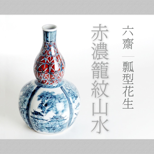 清水焼 六齋 瓢形花生 「赤濃籠紋山水」