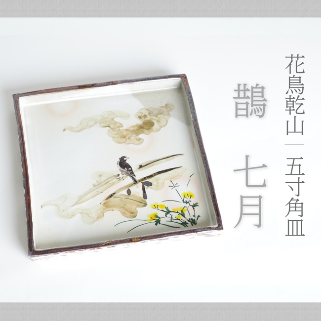 清水焼 花鳥乾山 五寸角皿 「鵲 七月」