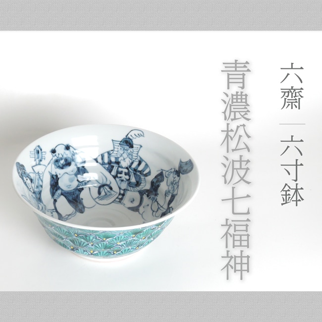 清水焼 六齋 六寸鉢 「青濃松波七福神」
