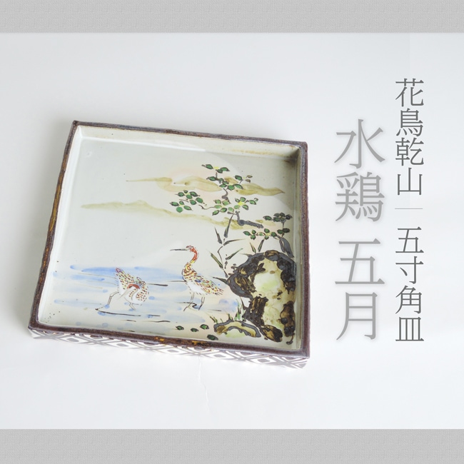 清水焼 花鳥乾山 五寸角皿 「水鶏 五月」