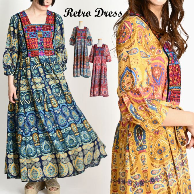 魅力ワンピ。6分袖レトロ柄ワンピース ワンピース 春 夏 レディース 半袖 6分袖 ロング マキシ丈 ワンピ レトロ 柄 総柄 ペ...