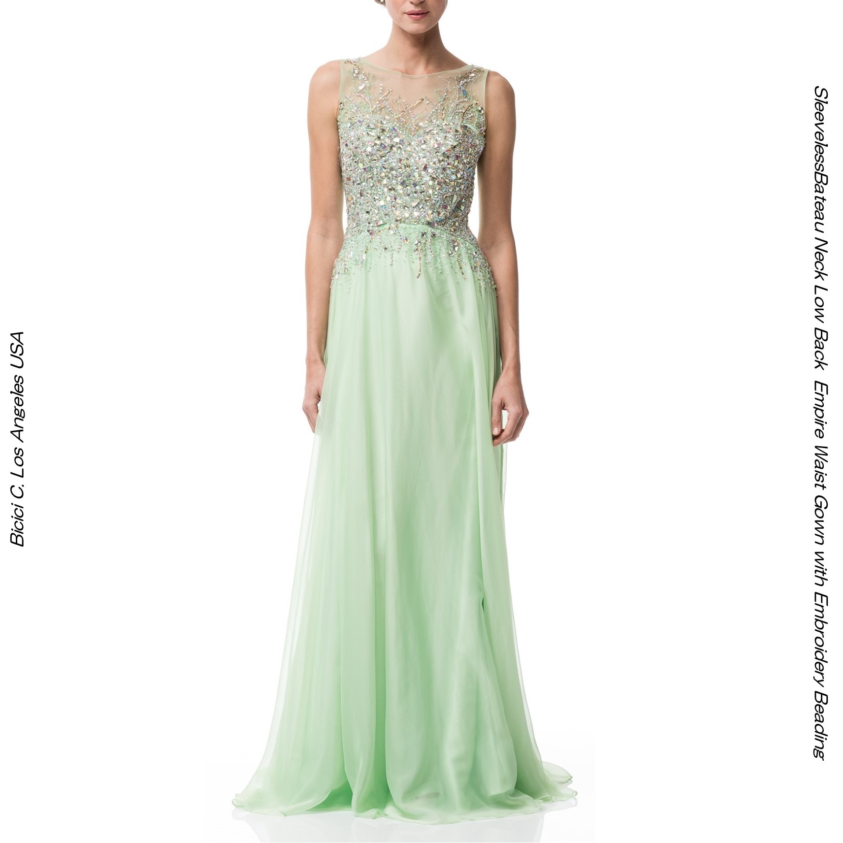 声楽ドレス ピアノ演奏 ノースリーブエンパイアドレス ミントグリーン オーロララインストーン ビジュエンブロイダリー 演奏会用ドレ...