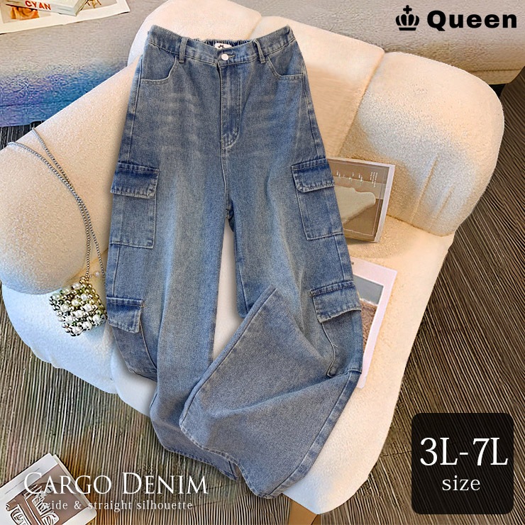 大きいサイズ レディース デニムパンツ カーゴパンツ ワイドデニム ジーンズ ウエストゴム 3L 4L 5L 6L 7L 秋 冬 ...