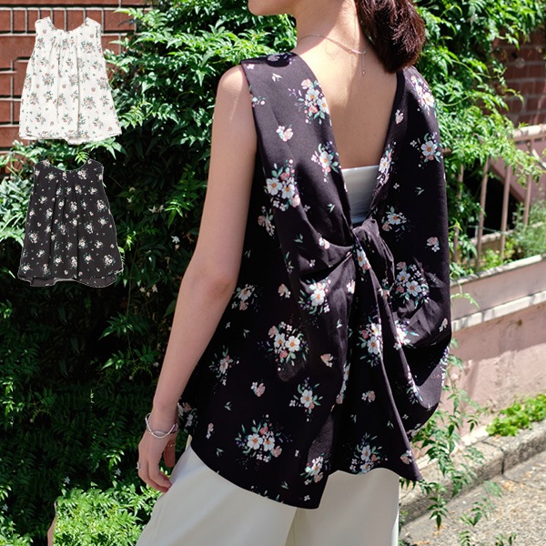 フラワー柄バックツイストノースリトップス
