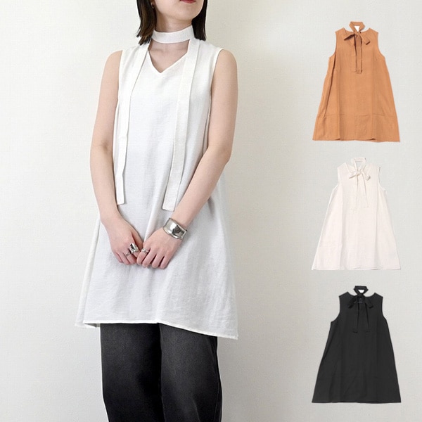 リネンタッチタイ付きチュニックブラウス