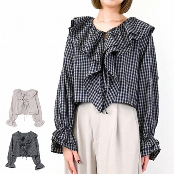 先染めチェックラッフルカラーブラウス