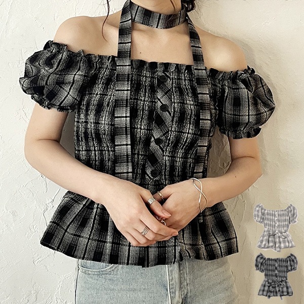 チェック柄パフスリーブオフショルダーブラウス