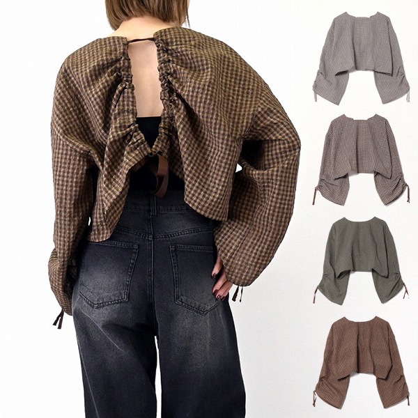 先染めチェックバックオープンドロストギャザートップス