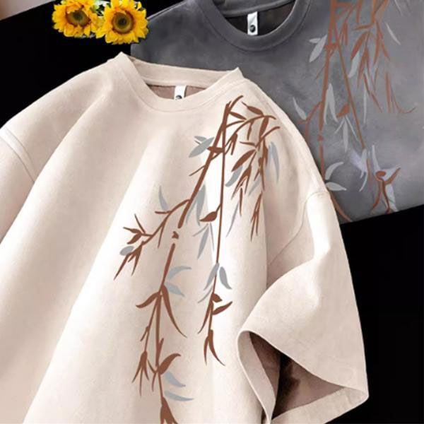 スウェード風Tシャツ 半袖 メンズ デイリーカジュアル 植物柄プリント ヘビーウェイト 肌触りの良い 生地 涼しい 夏 おしゃれ