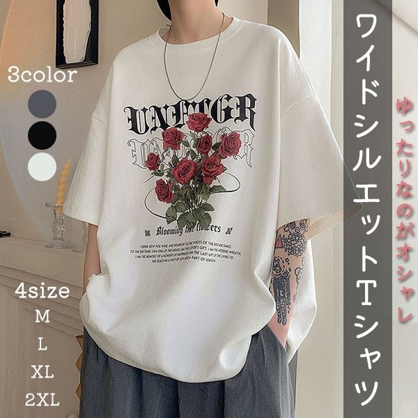 メンズ バラ ローズプリント Tシャツ 半袖 オーバーサイズ ゆったり ワイドシルエット 韓国 ファッション 通気性 お洒落 春 ...