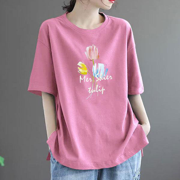 フラワープリント Tシャツ 手描き風 レディース トップス カットソー 五分袖 ゆったり ビッグシルエット オーバーサイズ 可愛い