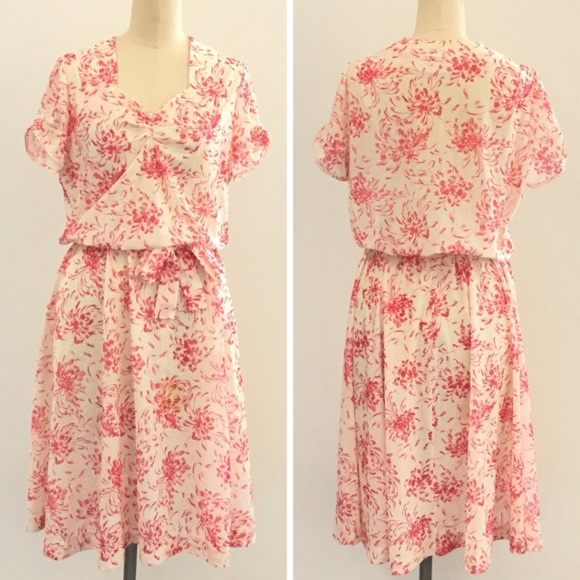 アメリカ古着 半袖ワンピース 総柄ドレス レディース S-M/クリームx赤 花柄 フラワープリント フレアスカート ポリワンピース...