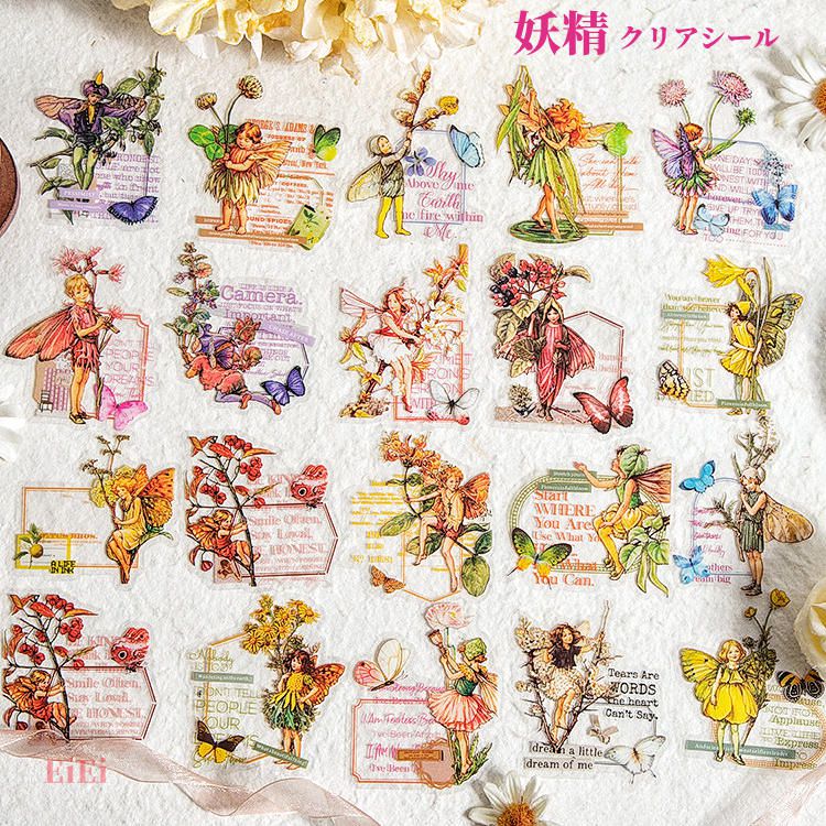 即日出荷 クリアシール 花の妖精たち 30枚 透明シール フレークシール 妖精 蝶 花 英字 透明ステッカー 海外 コラージュ 素...
