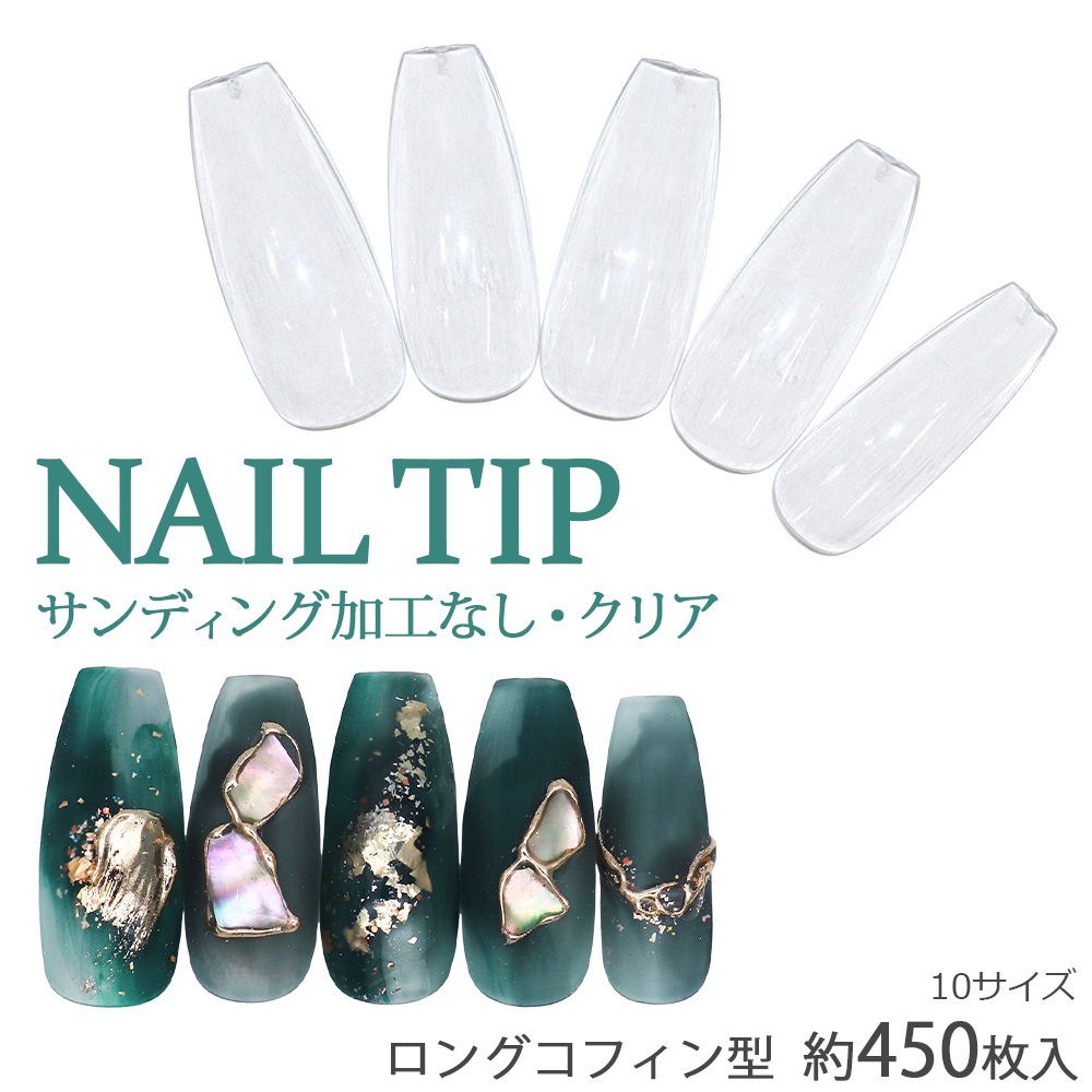 【ネコポス送料無料】ネイルチップ ロングコフィン型 サンディング加工なし クリア 透明 約450枚入り (10サイズ)