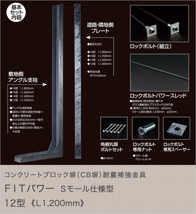 コンクリートブロック塀(CB塀)耐震補強金具 FITパワーSモール仕様型 12型(L1200mm)