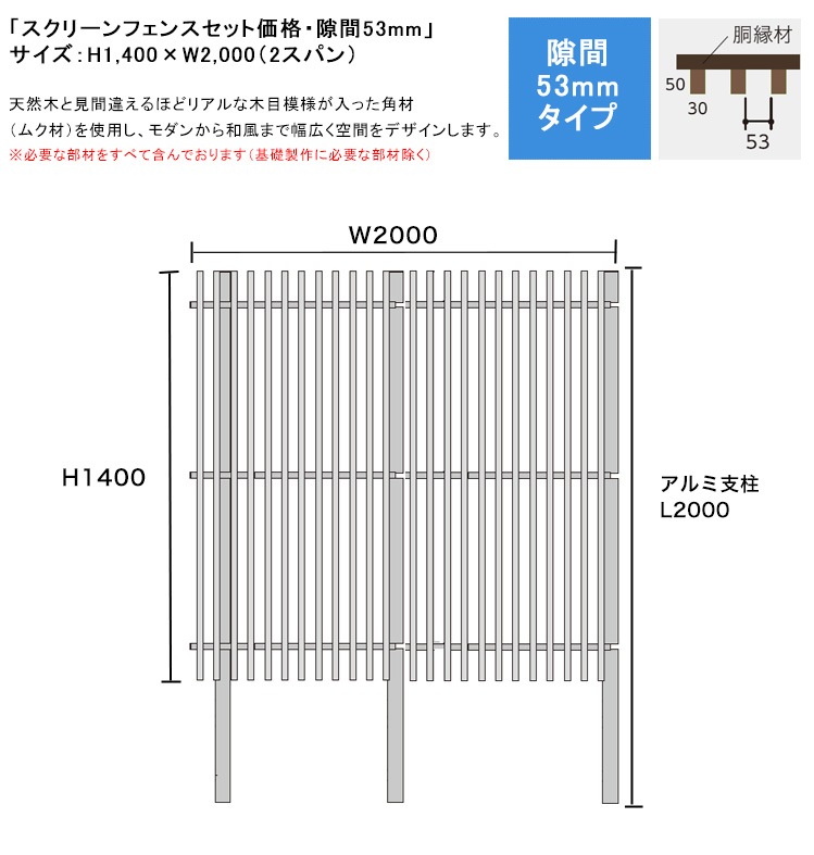 スクリーンフェンスセット価格・隙間53mmタイプ/サイズ:H1400×W2000 ※2スパン(S1/F1角材50×30・胴縁C30...