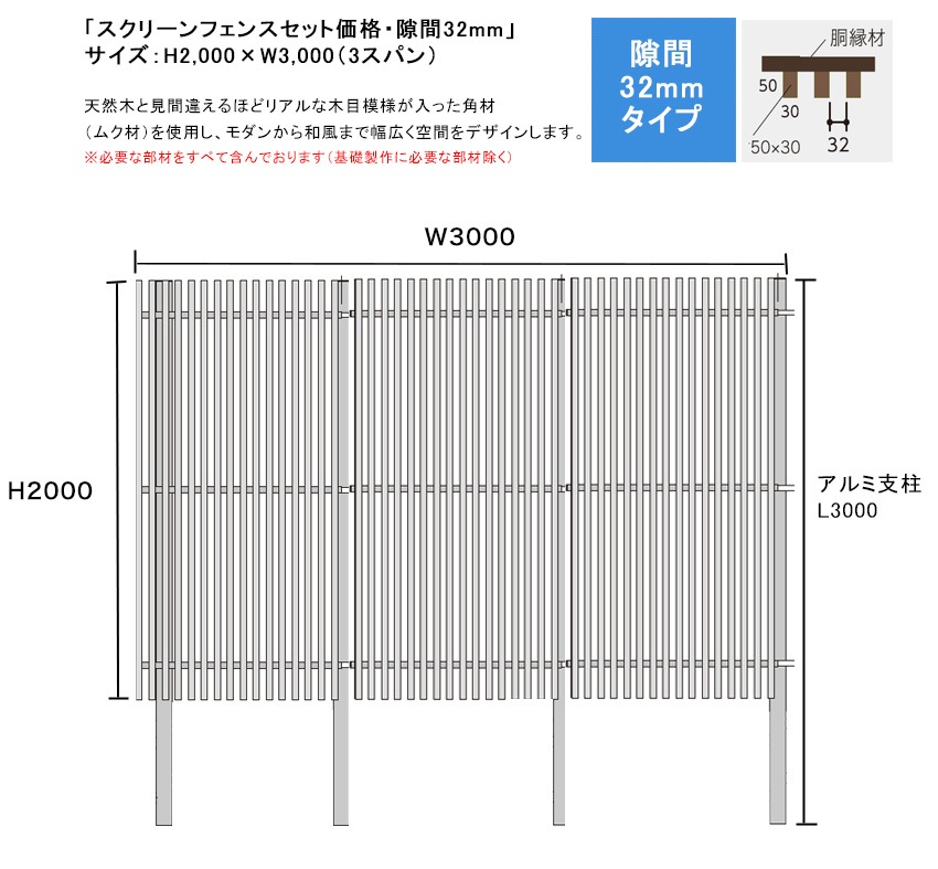スクリーンフェンスセット価格・隙間32mmタイプ/サイズ:H2000×W3000 ※3スパン(S1/F1角材50×30・胴縁C30...