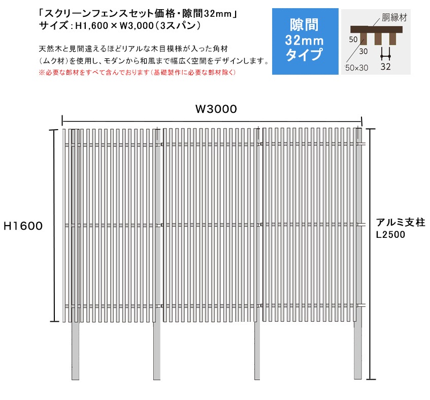 スクリーンフェンスセット価格・隙間32mmタイプ/サイズ:H1600×W3000 ※3スパン(S1/F1角材50×30・胴縁C30...