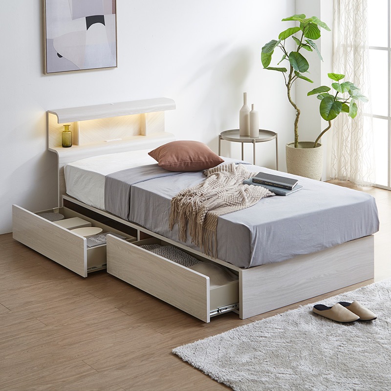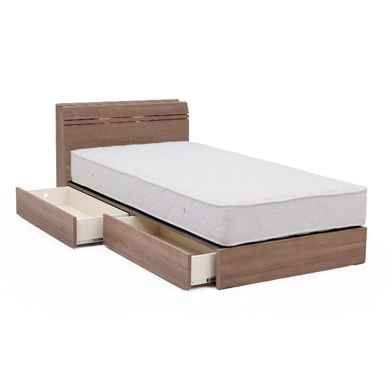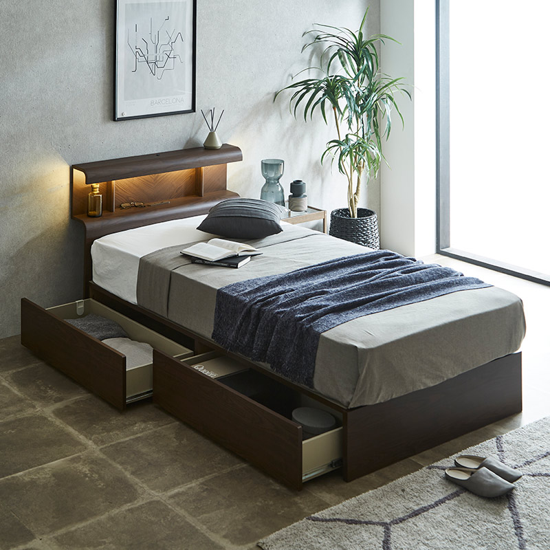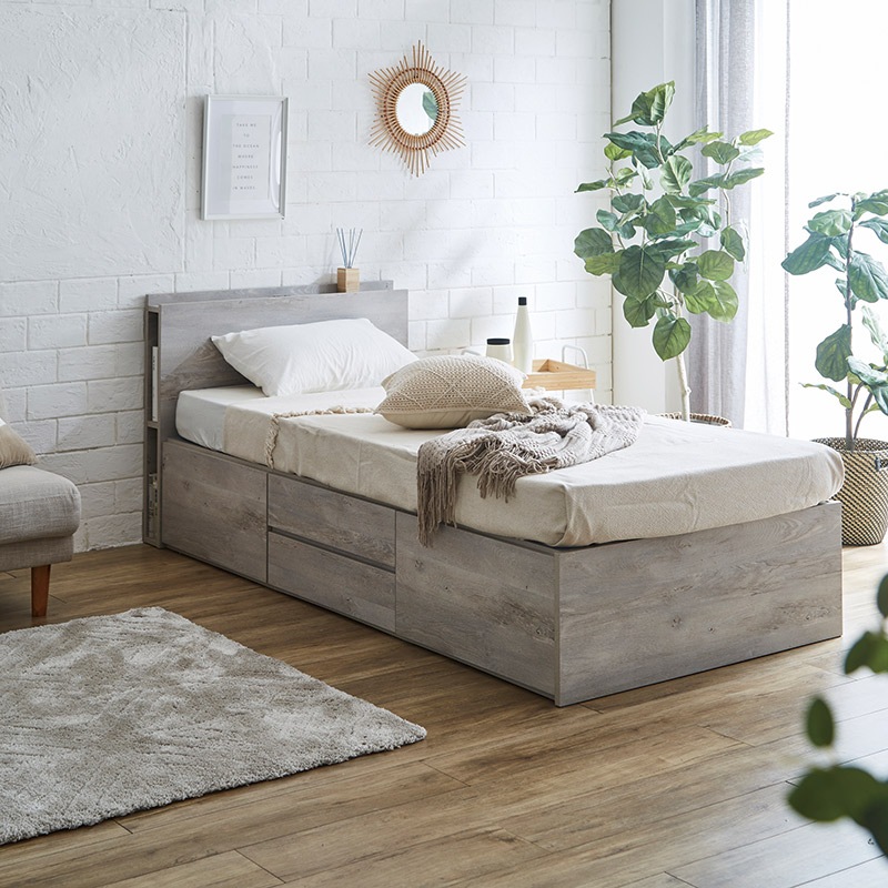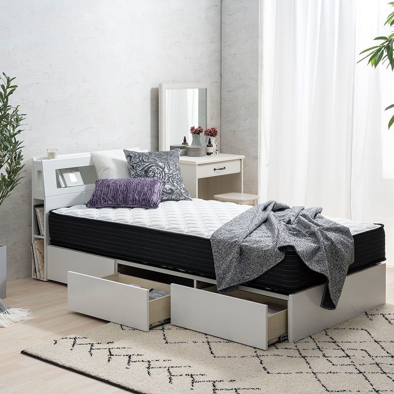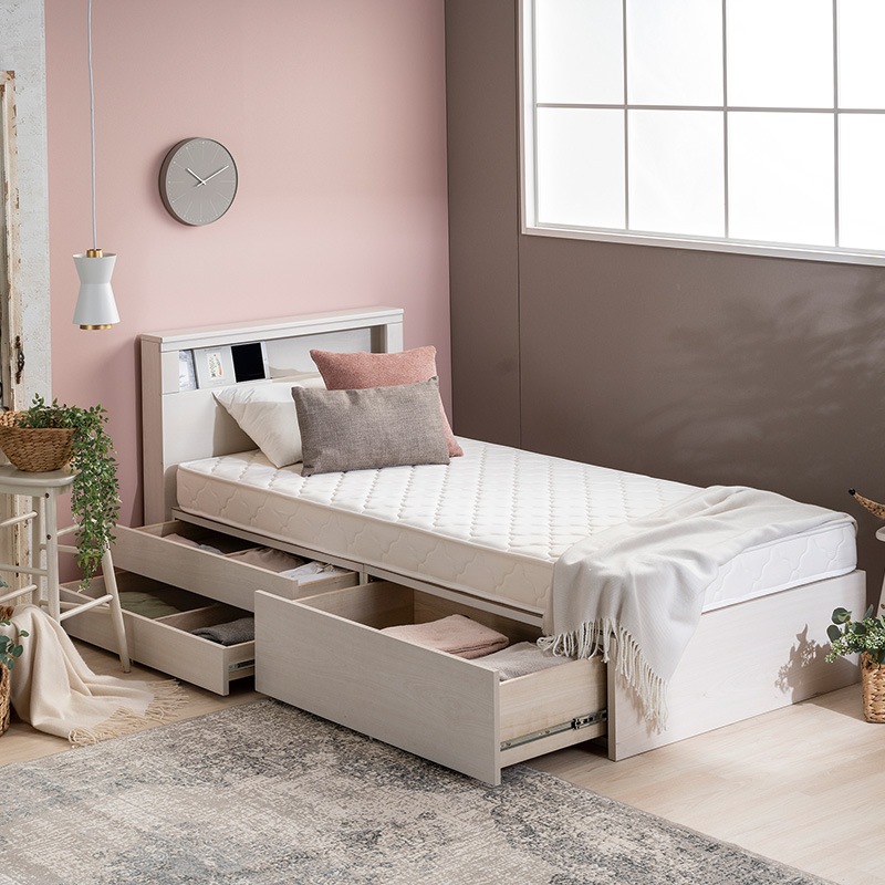 Office168厳選ベッド シングル ポケットコイルマットレス付き グレージュ 収納付き 引き出し付き 棚付き 宮付き コンセン...