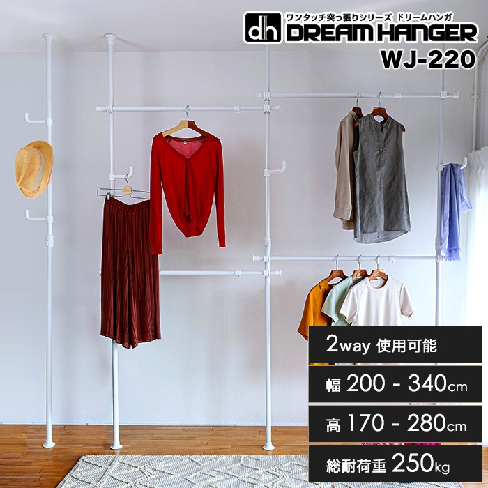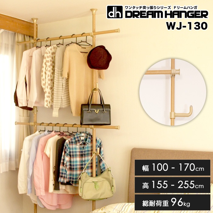 【簡単】ワンタッチ式突っ張りポールハンガーラック2段 高さ140-280cm 幅100-170cm 総耐荷重100kg ドリームハ...