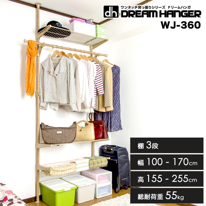 【在庫限り】【簡単】ワンタッチ式突っ張りポールハンガーラック 棚付き 3段 W 高さ155-255cm 幅100-170cm 総耐...