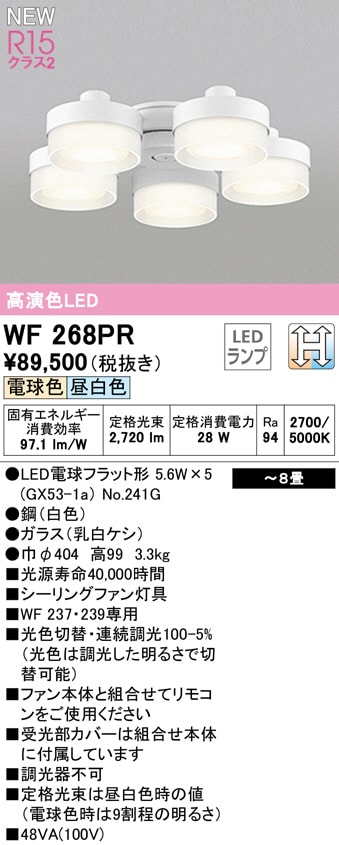 オーデリック WF268PR|LEDシーリングファン DCモーターファン(6枚羽根) 灯具・LED電球タイプ(電球色・連続調光・~...