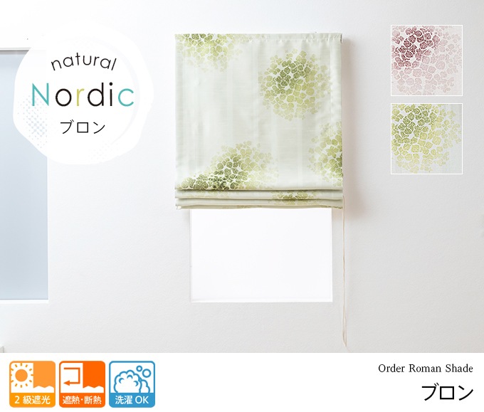 ナチュラル ノルディック 防炎 リリー(グリーン) オーダーローマンシェード/2級遮光 遮熱・断熱 防炎 洗濯OK 日本製