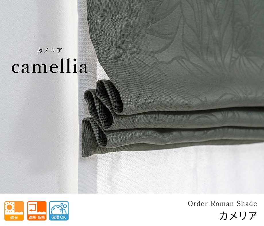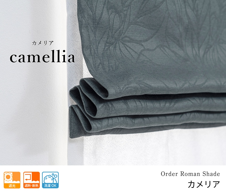エレガントなエンボス加工を施したボタニカル柄の1級遮光ダブルシェード「カメリア」チャコールグレー
