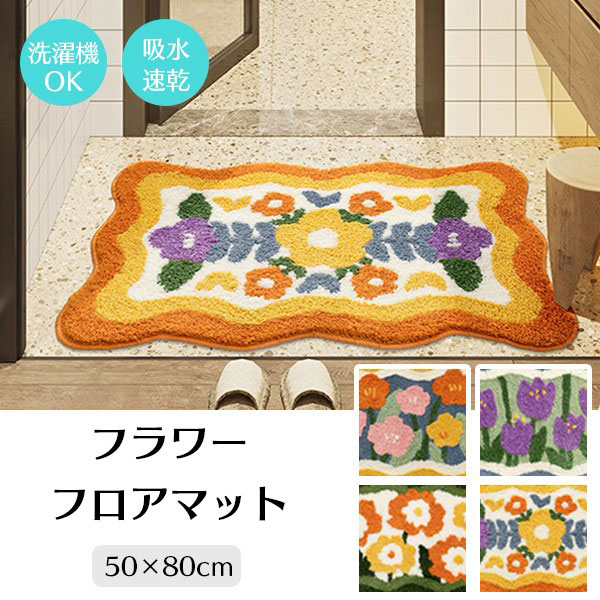【即納】フラワーフロアマット 50×80cm 室内 花柄 アクセントマット 厚手 マット 滑り止めパッド入り 玄関マット バスルー...