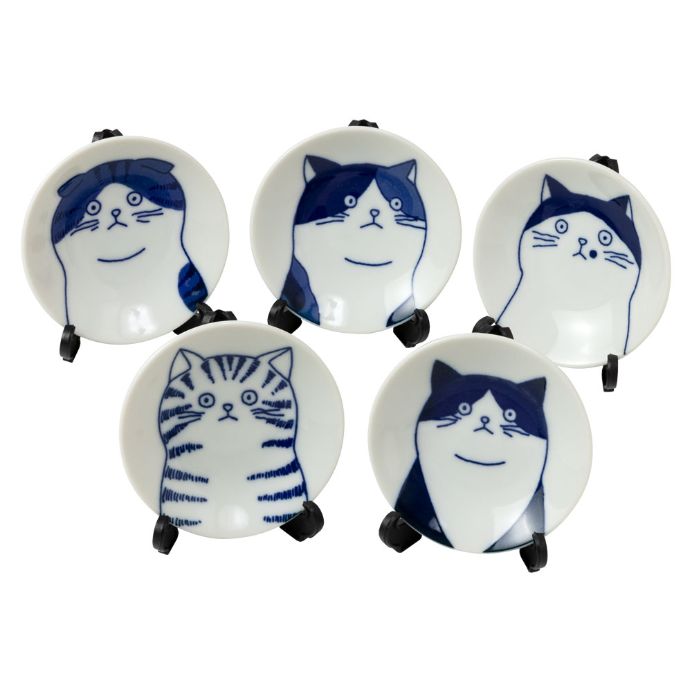 瀬戸焼 染猫いろいろ 8cm小皿 猫の豆皿5種+皿立セット 直径8cm 染付で描いたいろんなタイプの猫 愛知県の工芸品 Seto-...