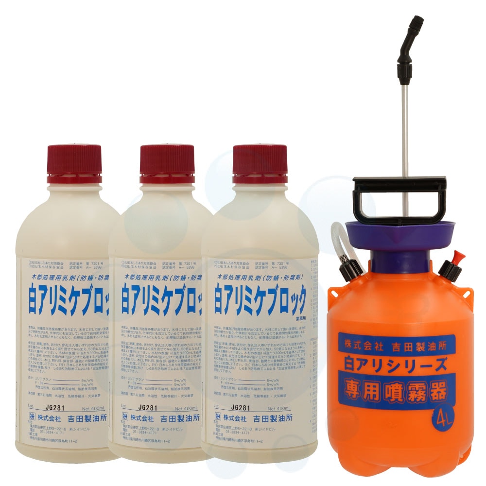 シロアリ駆除剤 白アリミケブロック業務用400ml×3本+4L専用噴霧器セット
