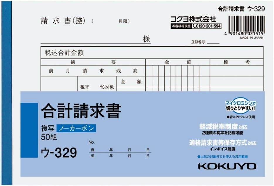 未使用品 コクヨ 合計請求書 複写簿 ノーカーボン B6 ヨコ 50組 ウ-329×2冊セット【送料無料】【メール便でお送りします...