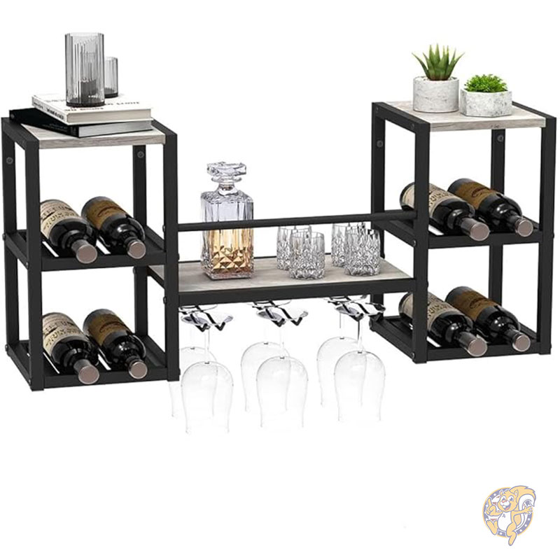 壁掛けワインラック インダストリアル グレージュ スチームグラスホルダー3個付き 木製棚 ブラックメタルボトルホルダー 多機能ワイ...