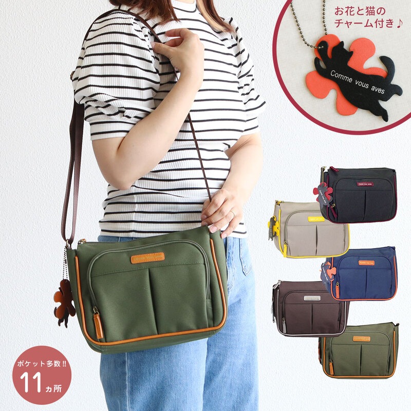 ショルダー バッグ レディース 斜めがけ 大人 ポケット ファスナー 旅行 マチ広 収納 整理整頓 多機能 婦人 猫 チャーム付き...