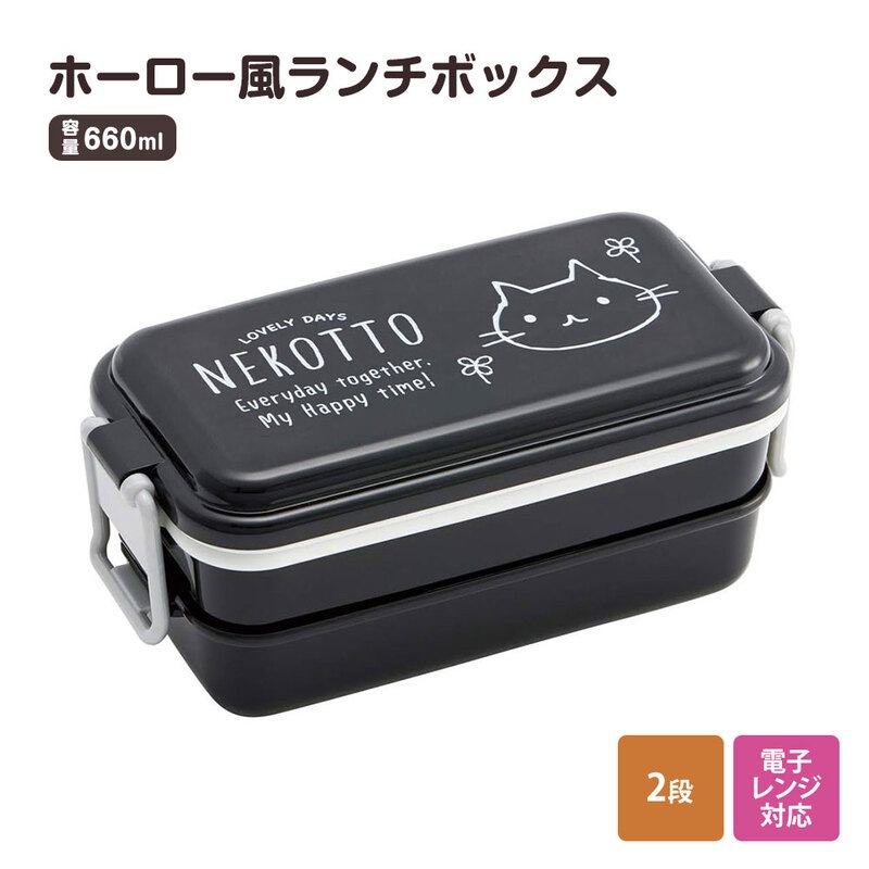 弁当箱 箸付き 600ml 2段 レディース 抗菌 電子レンジ ベルト付き 女性 大人 子供 おしゃれ かわいい ブラック 黒 猫...