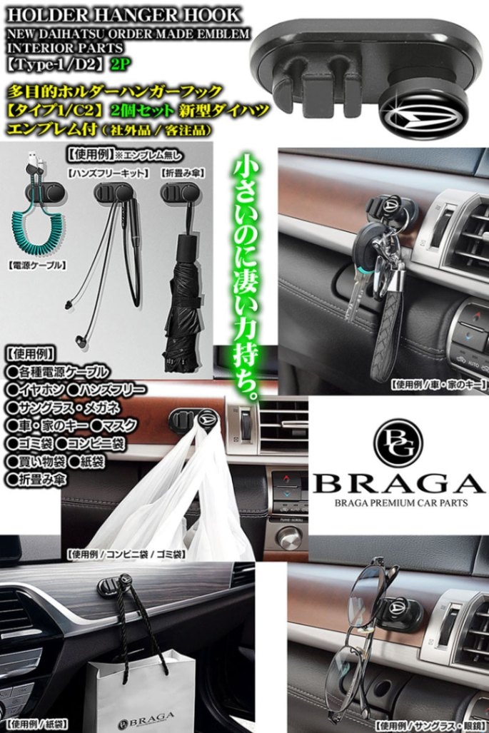 2個セット/多目的ホルダーハンガーフック/新型ダイハツDマーク エンブレム付/客注品【タイプ1/D2】ケーブル マスク 鍵 眼鏡 ...