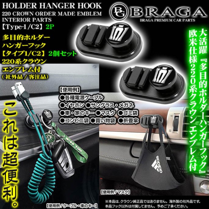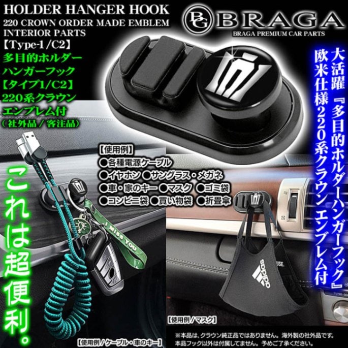 多目的ホルダーハンガーフック/220系クラウンマークエンブレム付/客注品/2個セット【タイプ1/C2】ケーブル マスク 鍵 眼鏡 ...