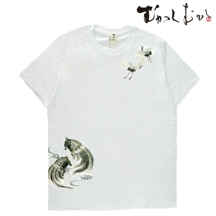 和柄 Tシャツ メンズ 半袖 京都 和柄ブランド 手描友禅 京高盛絵 プリント むかしむかし 鶴亀 白 ホワイト