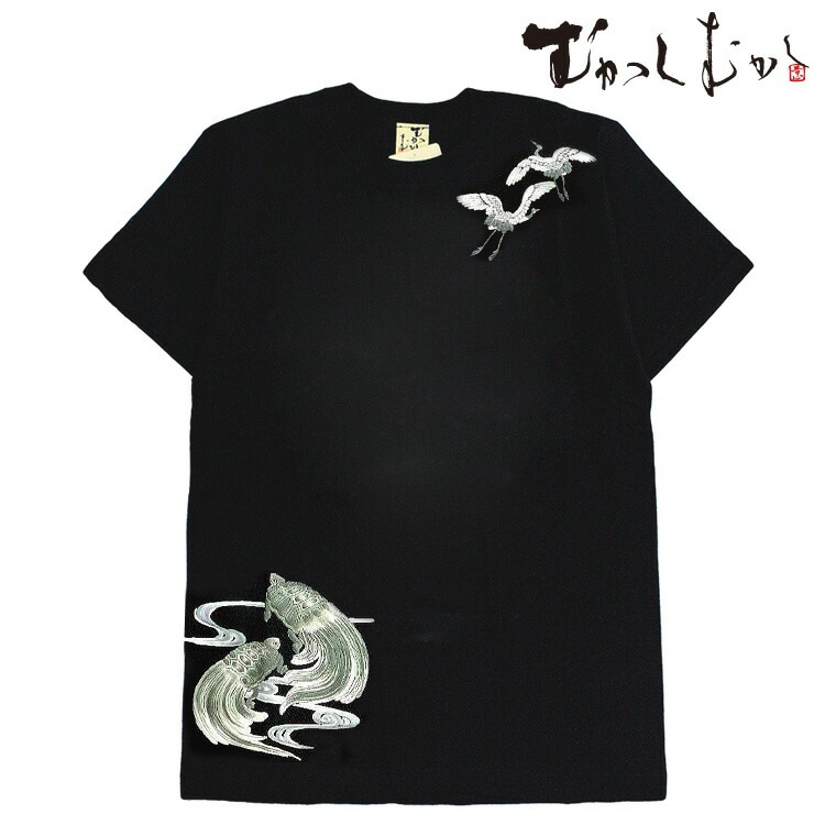 和柄 Tシャツ メンズ 半袖 京都 和柄ブランド 手描友禅 京高盛絵 プリント むかしむかし 鶴亀鯛 黒 ブラック