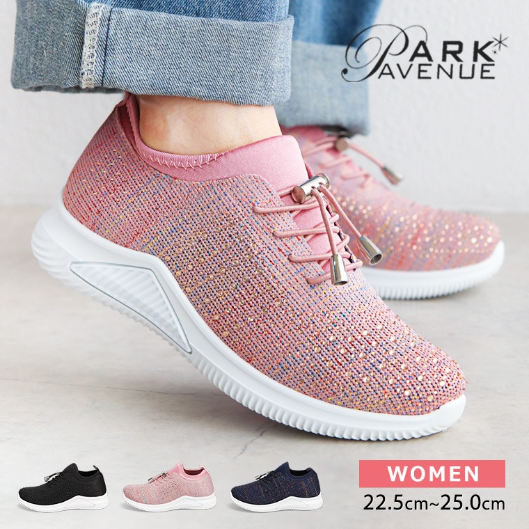ニットスニーカー レディース ローカット 軽い ジュニア アッパーニット ラインストーン ブラック ネイビー ピンク PARK A...