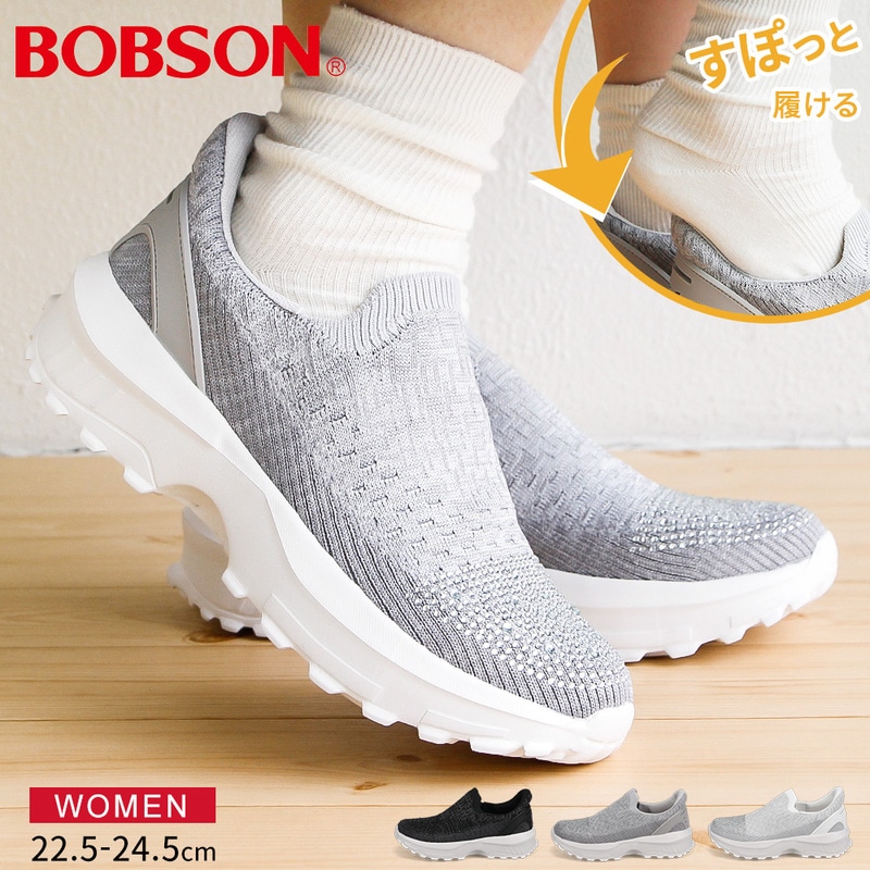 ボブソン スリッポン レディース ローカット 歩きやすい 軽量 ハンズフリー 靴 ニット 黒 ブラック グレー 白 ホワイト B...