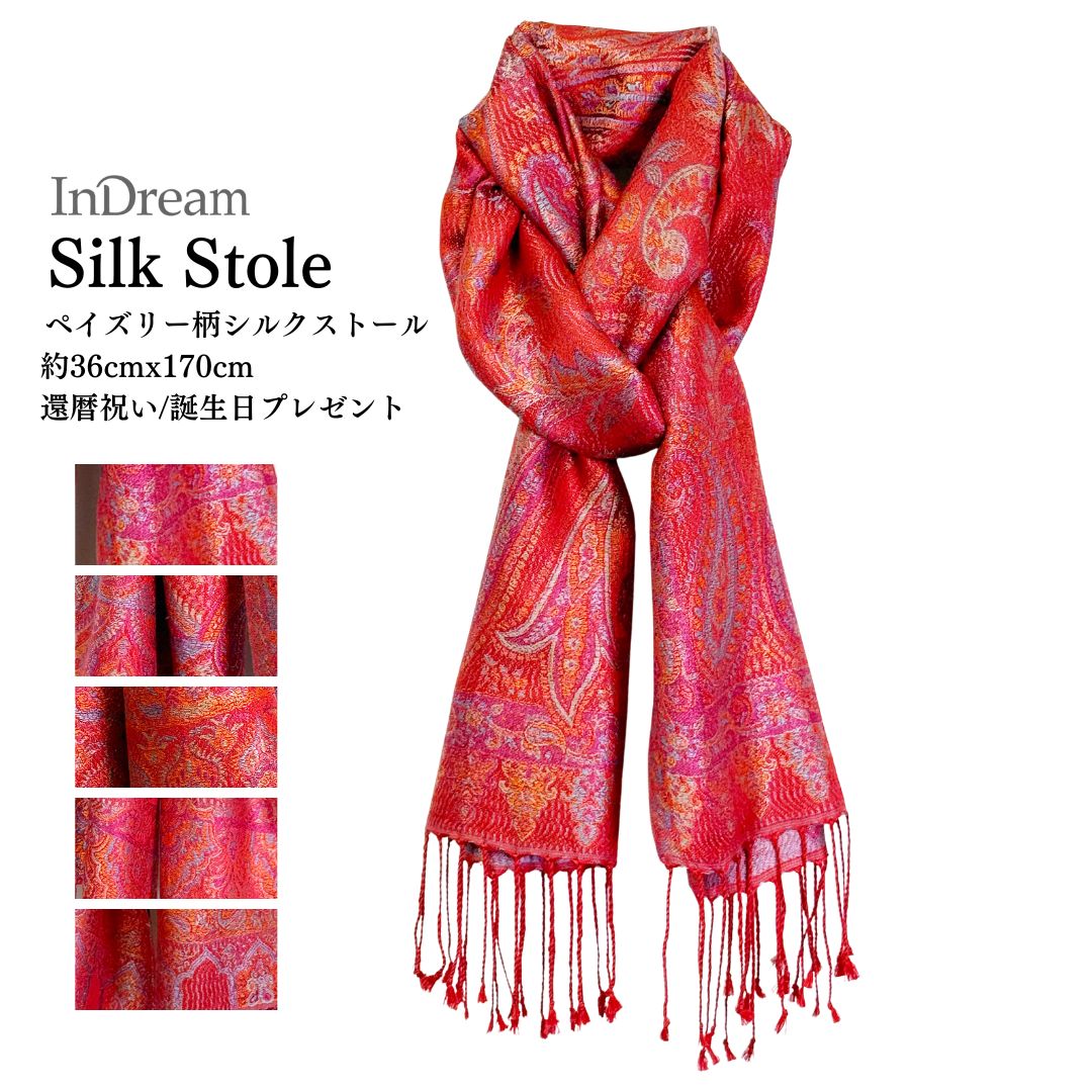 InDream ペイズリー柄 シルク ストール 大判 [75cmx200cm]オレンジ 赤 マルチカラー 秋 冬 誕生日 プレゼン...