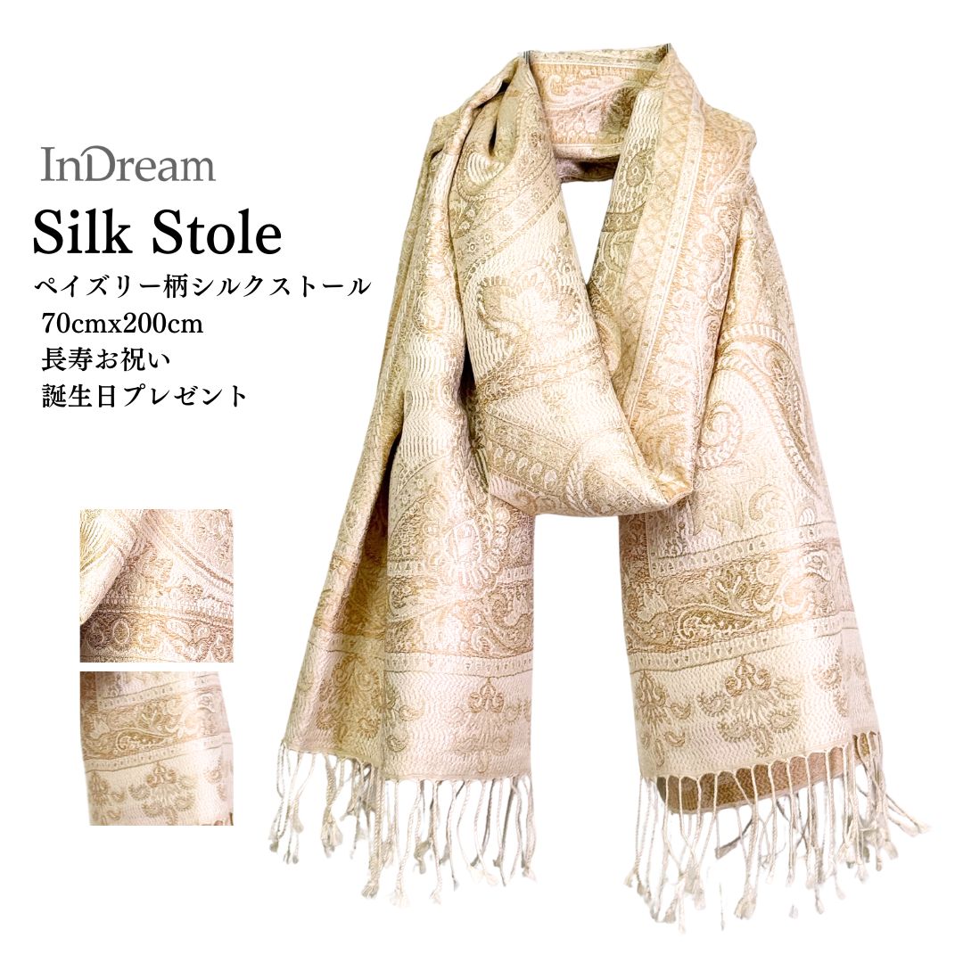 InDream ペイズリー柄 シルク ストール 大判 70cmx200cm ショール アイボリー 古希 お祝い 着物ショール 春 ...