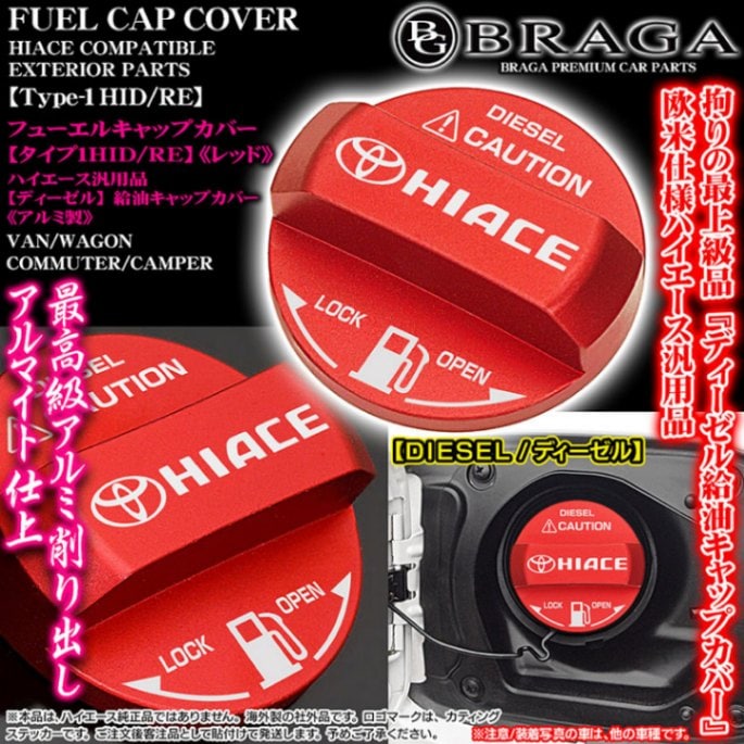 [タイプ1HID/RE]ハイエース ディーゼル給油フューエル キャップ カバー[アルミ製アルマイト/レッド]カッティングステッカー...