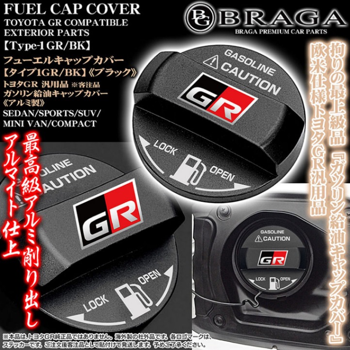 [タイプ1GR/BK]トヨタGR 給油 フューエル キャップ カバー[アルミ製アルマイト/ブラック]GR 3色ロゴマークステッカー...