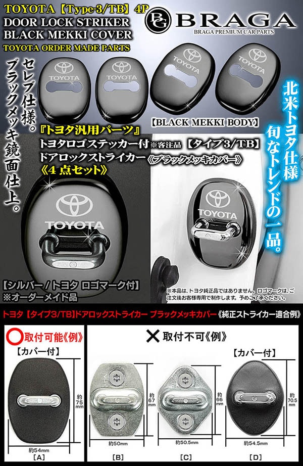 【タイプ3/TB】トヨタロゴ&Tマーク付(客注品)トヨタ汎用ドアロック ストライカー《ブラックメッキカバー》4点セット/鏡面研磨/...