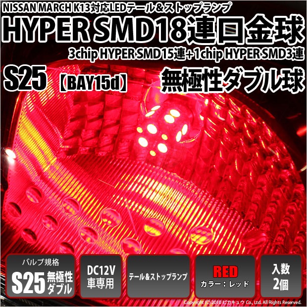 【メール便可】ニッサン マーチ[K13系 前期モデル]対応 テール&ストップランプ用LED S25d[BAY15d]3chip H...