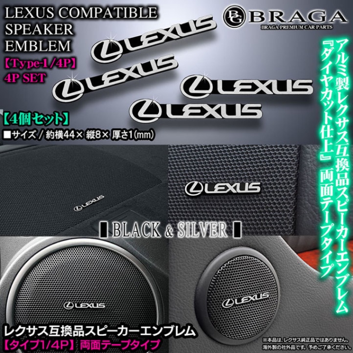 レクサス互換品スピーカーエンブレム[タイプ1/4P]4個セット[両面テープ止め]アルミ製シルバーロゴマーク&ブラック/ダイヤカット...