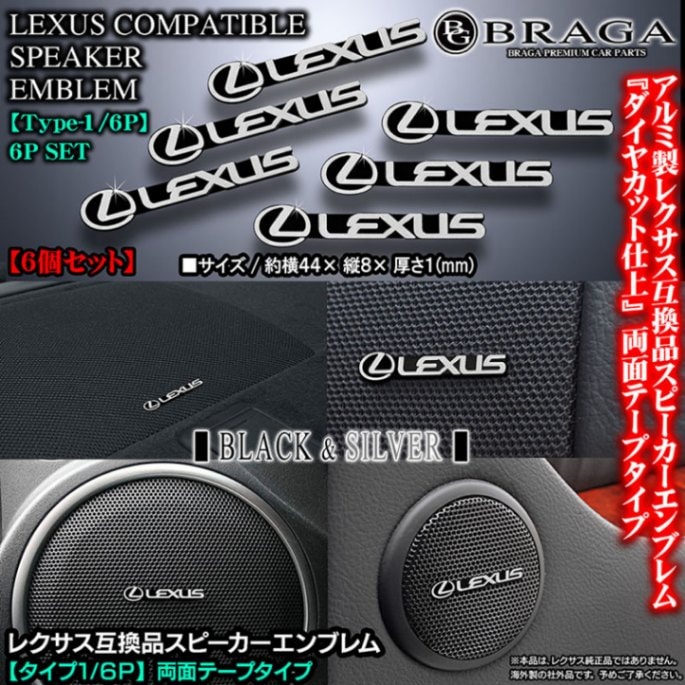 レクサス互換品スピーカーエンブレム[タイプ1/6P]6個セット[両面テープ止め]アルミ製シルバーロゴマーク&ブラック/ダイヤカット...