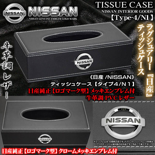 【日産車】《日産/NISSAN》ティッシュケース/牛革調PVC合成レザー【タイプ4/N1・ブラック】日産純正メッキエンブレム付/ブ...